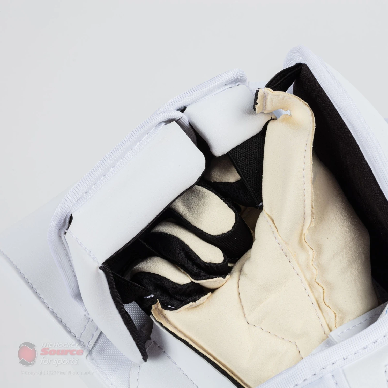 The cuff on the Bauer GSX blocker has a velcro closure, enabling a well fitting blocker, but allowing mobility and freedom to move and adjust.