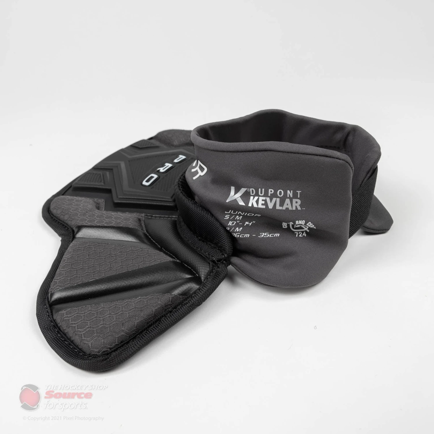The collarbone area of the Pro neck guard uses a combination of Bauer’s new rebound control foam and other HD foams to resist and protect against impacts. The kevlar collar is skate cut resistant while offering a less bulky feel than the Supreme neck guard it replaces.