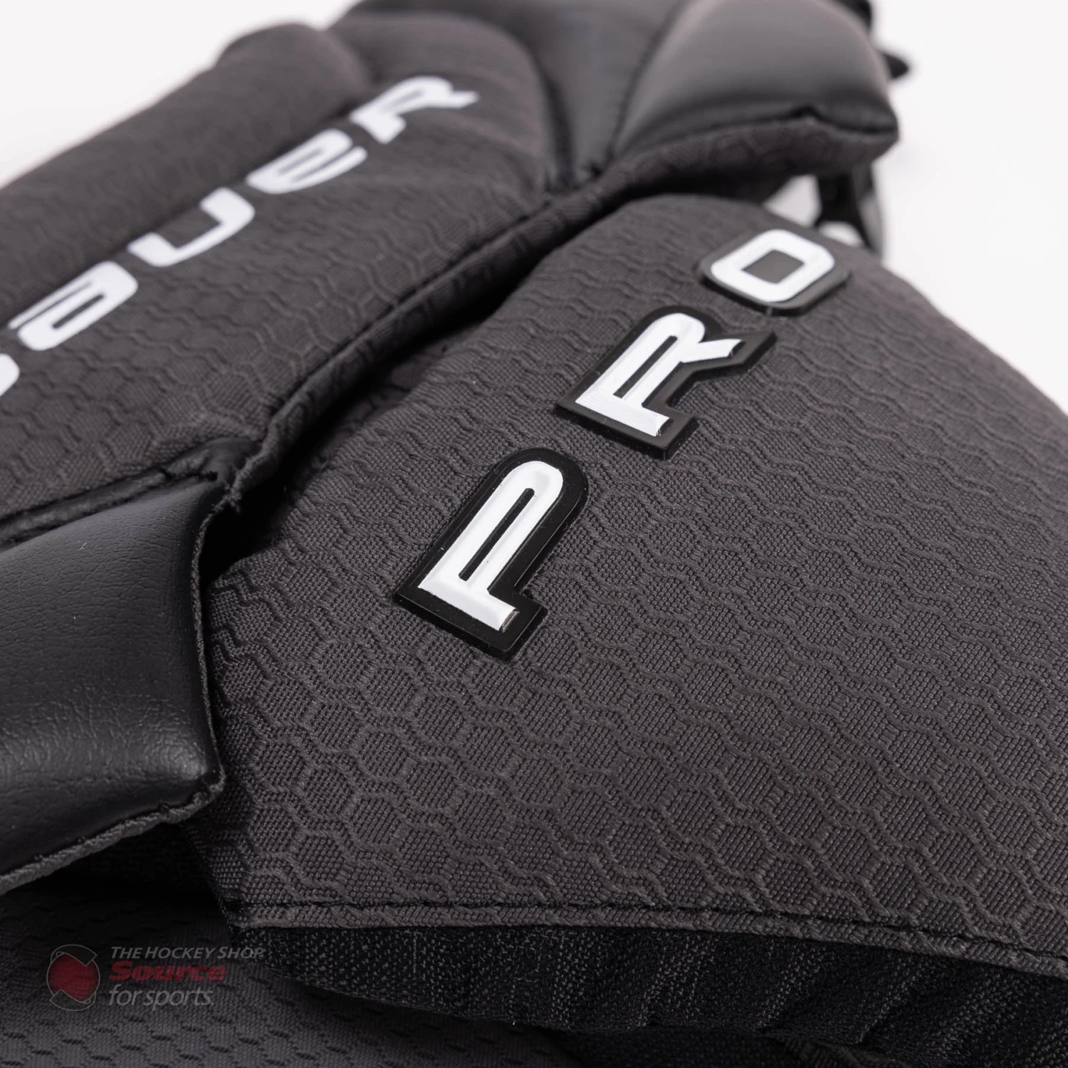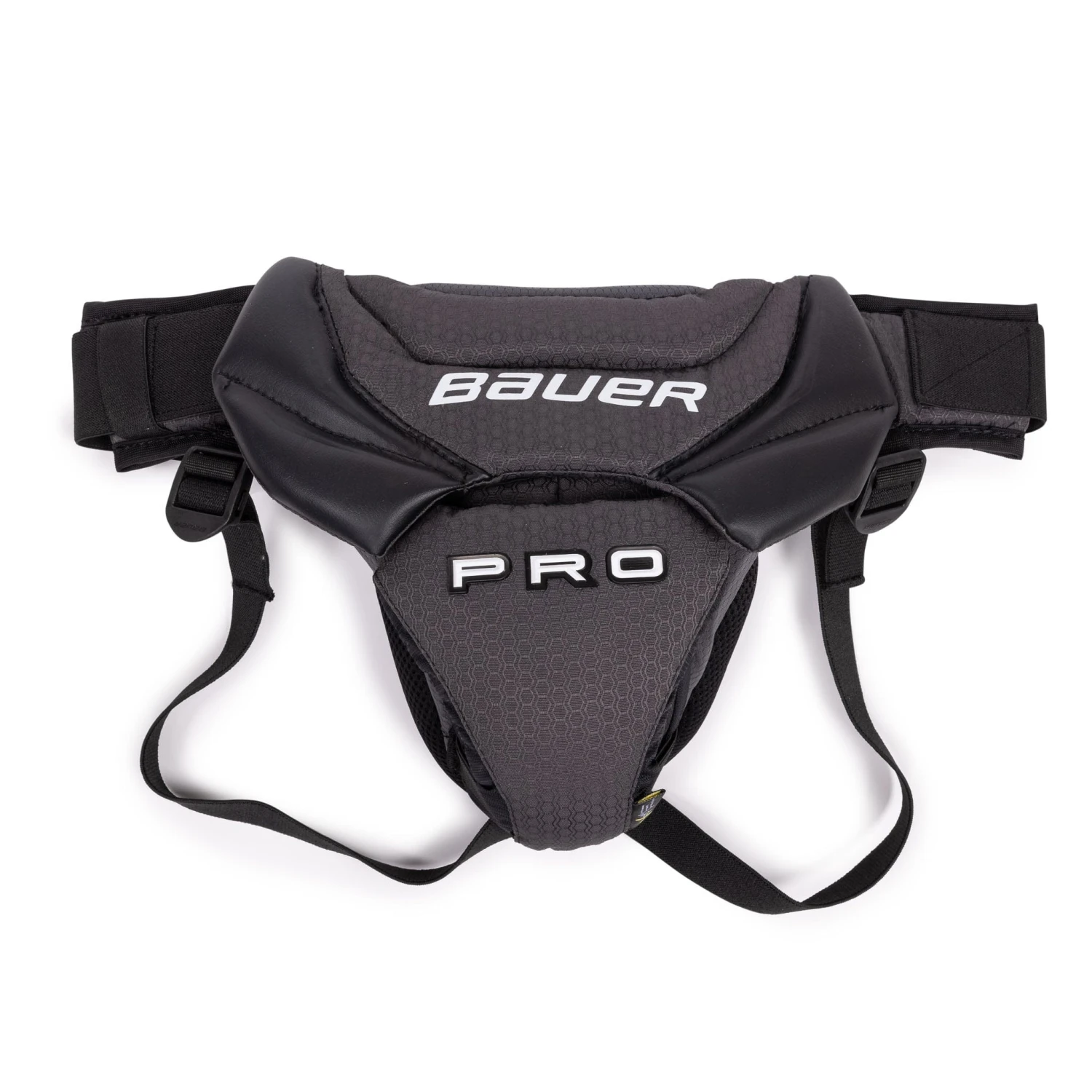 The Bauer Pro Senior Goalie Jock comes in one size only and has a simple black and grey appearance with bright white logos.
