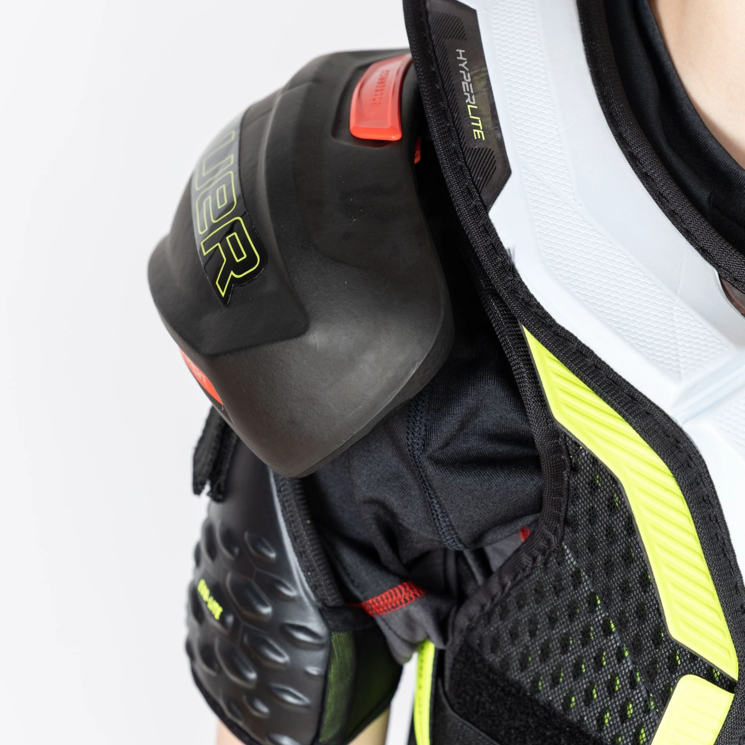 The Bauer Vapor Hyperlite Junior Shoulder Pads are available in Small and Medium sizes. If you are looking for a larger size, the Hyperlite gear is also available in Senior sizing.
