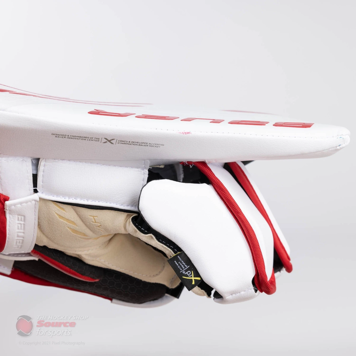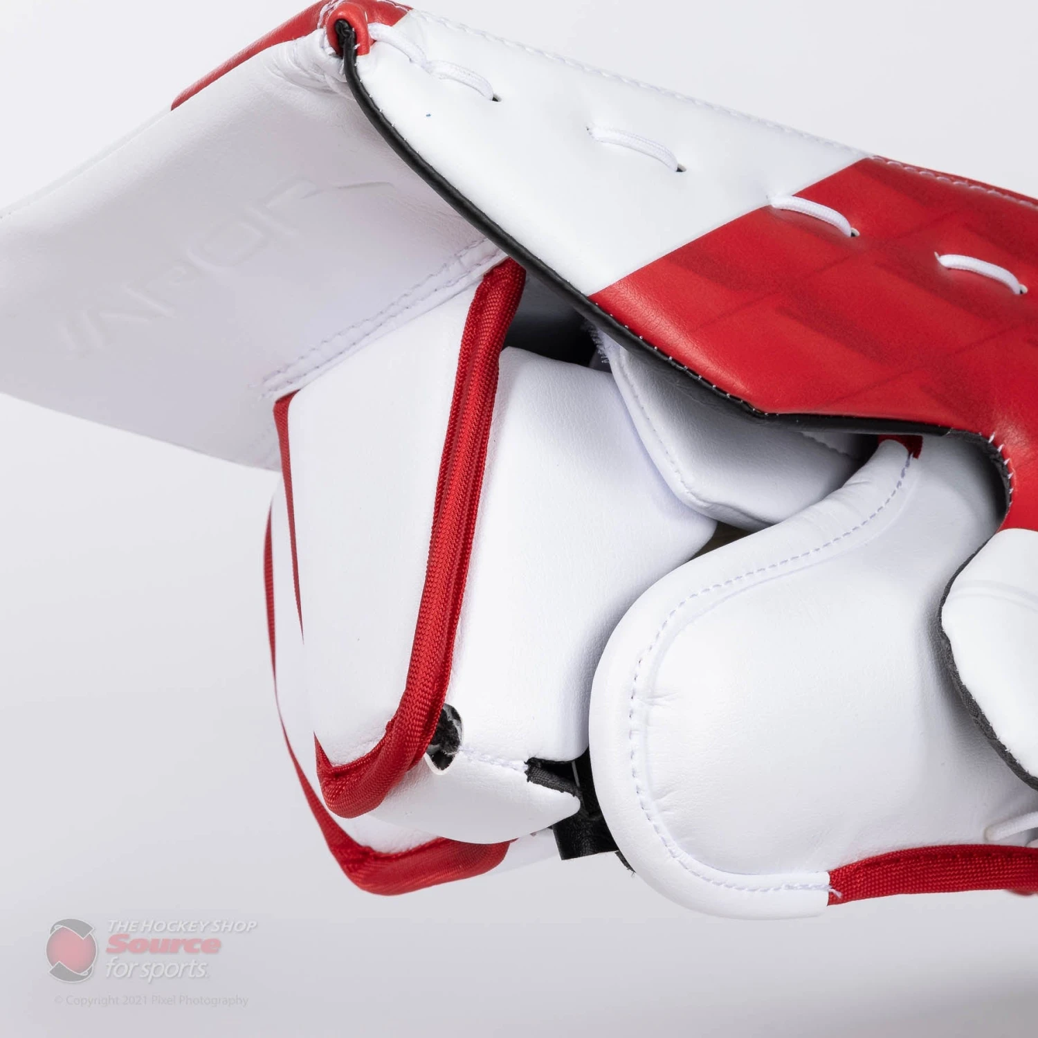 The Vapor Hyperlite Blocker is offered in the stock colours of all White, White/Black, White/Navy, White/Blue and White/Red. However, goalies that seek more custom options can customize their dream set on Bauer.com. Bauer also offers their True Design custom graphics program, creating endless possibilities for goalies through their digi-print capabilities.