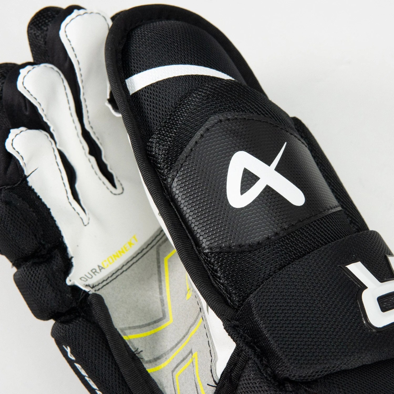 The external material is made of pro-style cable mesh, which is a classic choice for gloves due to its solid strength and cut resistance. This cable mesh is pro-style, meaning it is used even at the pro level to keep your gloves in place and intact for longer, even at some of the highest levels of hockey.